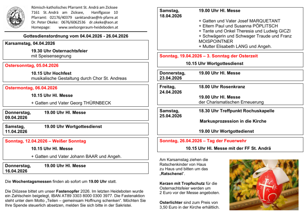 Gottesdienstordnung vom 4. bis 19. April 2026