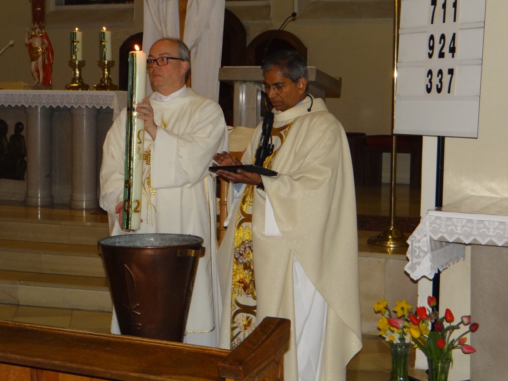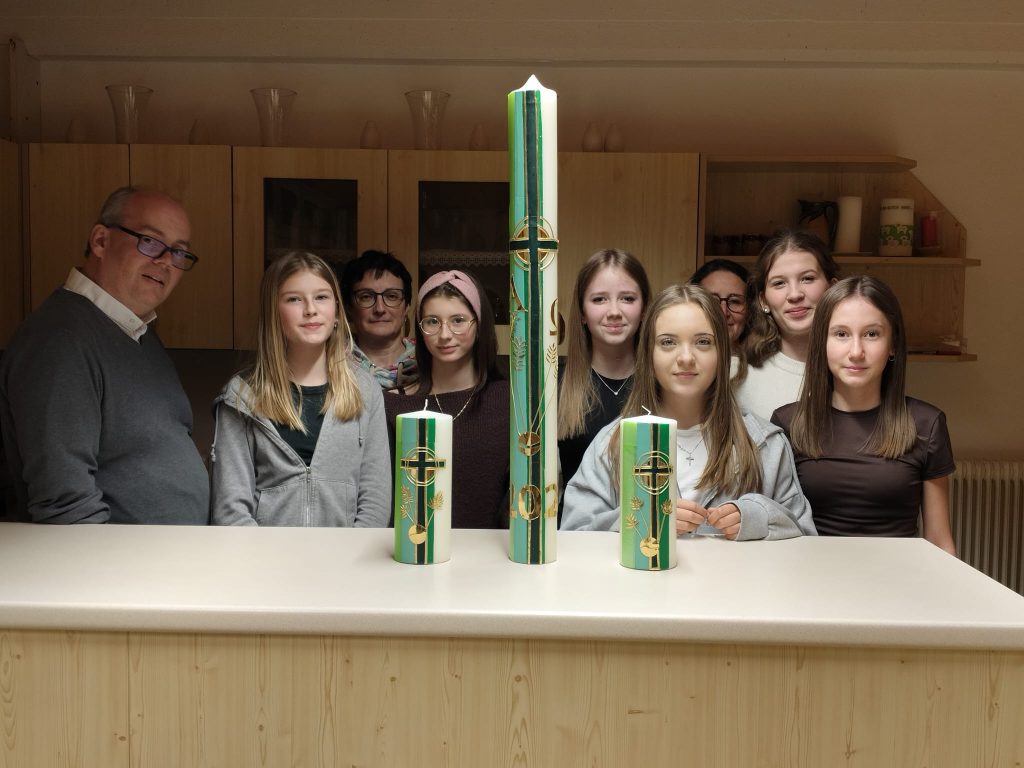 Die Osterkerze 2026 und zwei Altarkerzen wurden von Diakon Andreas, Anita und Bettina und den Jugendlichen Fabienne, Jana, Lara, Lena, Lilli und Olivia gestaltet.